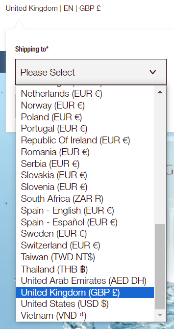 Wenn Sie auf der Desktop-Seite sind, können Sie die Region auswählen, indem Sie oben links auf das Land klicken. Es wird dann eine Dropdown-Liste aller unserer globalen Websites angezeigt, wie unten gezeigt: